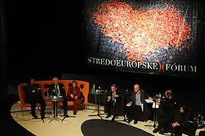 Its main activity is concentrated around a panel discussion attended by expert speakers from all over the world, which is open to the general public. The first Central European Forum (2009) managed to gather 25 outstanding personalities including writers (as the Russian Viktor Erofeyev, German Ingo Schulze, Austrian Robert Menasse, Hungarian György Konrád), historians (as the US Professors Timothy D. Snyder and Marci Shore), political scientists (the French and Czech Jacques Rupnik, Slovak Professor and Charter 77 spokesman Miroslav Kusý, British Professor Mary Kaldor), philosophers (the Hungarian Professor Ágnes Heller), NGO leaders (the US NGO-leader Wendy Luers), politicians (Václav Havel, Karl zu Schwarzenberg, the Belgian EEP President Wilfried Martens and the Slovak ex-finance minister and current EBRD vice-president Brigita Schmögnerová) and journalists (such as the polish journalist, historian and dissident Adam Michnik, the founder and editor-in-chief of Gazeta Wyborcza). Four main themes were discussed by the panelists under the general slogan “What happened to democracy?”: Where does the West begin?; Open society in crisis; Totalitarian Structures - A new lease of life; and Democracy fatigue.[1]