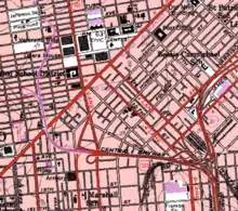 The route was also included in the 1955 city master plan, by then extending north beyond the former Broadway terminus to the proposed Golden Gate Freeway near Lombard Street.[8] The first piece, connecting the Bayshore Freeway with Mission Street, opened March 1, 1955,[9] at about the same time as the Bayshore. The part of the Central Freeway to the one-way pair of Golden Gate Avenue and Turk Street opened in April 1959,[10][11] and became part of U.S. Route 101 (and Legislative Route 2) via this one-way pair to the old route on Van Ness Avenue.[12] In January of that year, as one of the opening events in the freeway revolts, the San Francisco Board of Supervisors passed Resolution 45-59, removing the remainder of the Central Freeway and most other proposed freeways from the city's highway plan.[13] Interstate 80, which had been assigned to the Central Freeway southeast of the proposed Panhandle Freeway, was truncated by the Federal Highway Administration in August 1965 and by the state in 1968.
