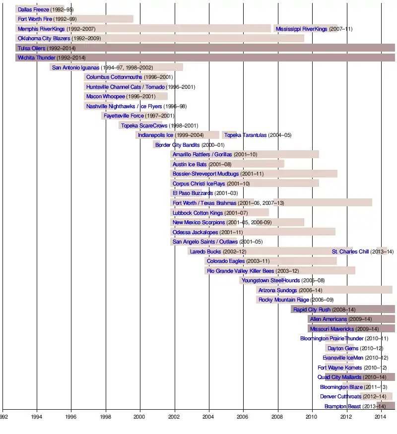 | 1992–93 | 6 | Dallas Freeze Fort Worth Fire Memphis RiverKings Oklahoma City Blazers Tulsa Oilers Wichita Thunder |