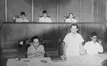 The Japanese invaded Indonesia in 1942. By 1943 the tide had turned against them, and in order to encourage support for the war effort, the Japanese appointed Indonesian advisors (參預 sanyo) to the administration and appointed nationalist leader Sukarno leader of a new Central Advisory Board (中央參議會 Chūō Sangi-kai) in Jakarta.[2] In March 1945, the Japanese established the Investigating Committee for Preparatory Work for Independence (Indonesian: Badan Penyelidik Usaha Persiapan Kemerdekaan) or BPUPK, chaired by Radjiman Wediodiningrat, with Sukarno, Hatta and Thamrin among its members. This body drew up a constitution for an independent Indonesia over several weeks of meetings. At a session of the Committee on 1 June 1945, Sukarno laid down the principles of Pancasila, which would become the Indonesian national ideology.[3][4]