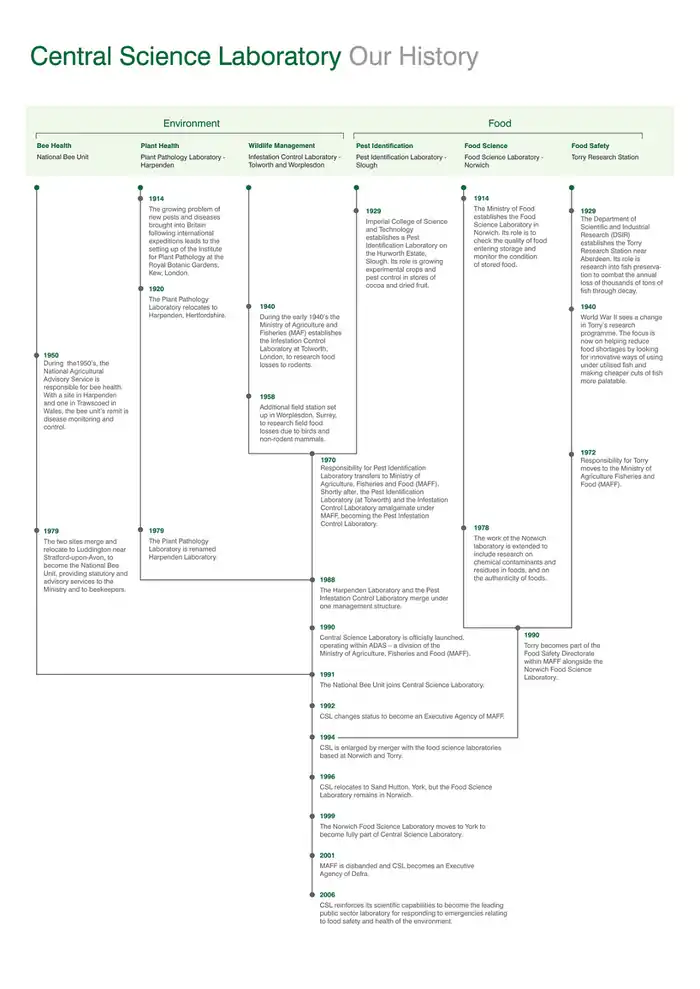 The Harpenden Laboratory and the Pest Infestation Control Laboratory, both operating within the Agricultural Science Service of the Agricultural and Development Advisory Service (ADAS) - a division of the Ministry of Agriculture, Fisheries and Food (MAFF) - come together under single management. Forerunners of CSL, the laboratories share common scientific objectives in relation to the safe and efficient production of food and the protection of the consumer and the environment.