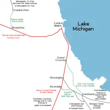 Also sharing the station was the Michigan Central Railroad, part of the New York Central Railroad system, which had shared the IC's terminal from its opening in 1852. The Michigan Central connected with the Illinois Central at Kensington. The Cleveland, Cincinnati, Chicago and St. Louis Railway (Big Four), also a New York Central line, joined the IC at Kankakee and also used Central Station. Using the station from the beginning was the Chicago and West Michigan Railway, consolidated into the Pere Marquette Railroad in 1900. At the time it used the Michigan Central west from New Buffalo, Michigan.