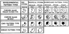 Within the Dvorak satellite strength estimate for tropical cyclones, there are several visual patterns that a cyclone may take on which define the upper and lower bounds on its intensity. The central dense overcast (CDO) pattern is one of those patterns. The central dense overcast utilizes the size of the CDO. The CDO pattern intensities start at T2.5, equivalent to minimal tropical storm intensity, 40 mph (64 km/h). The shape of the central dense overcast is also considered. The farther the center is tucked into the CDO, the stronger it is deemed.[5] Banding features can be utilized to objectively determine the tropical cyclone's center, using a ten degree logarithmic spiral.[11] Using the 85–92 GHz channels of polar-orbiting microwave satellite imagery can definitively locate the center within the CDO.[12]
