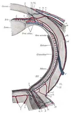 ![]() Diagram of the blood vessels of the eye, as seen in a horizontal section. (Central retinal vein not labeled, but region is visible. The central retinal vein is at bottom running away from the retina through the optic nerve.) | |