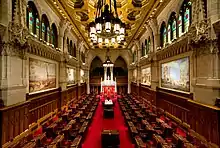 Directly across the Hall of Honour is the Reading Room, where the governing party's caucus meets.[43]