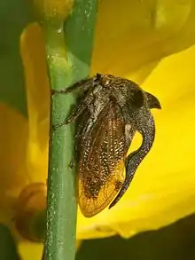They can be encountered from early May through early August.[3][4] Both males and females can produce sounds and they are able to jump as orthoptera. After mating at the end of June and early July the females lay several eggs in the stalk of herbaceous plants, on which hatching larvae feed. These "treehoppers" are polyphagous, feeding on plant juices, which they take with their specially built, piercing-sucking mouth parts. The larvae mainly live on Cirsium, Carduus and Urtica species, while the adult insects prefer Populus, Quercus and Rubus species.[3] They overwinter in the litter layer in the larval stage and have a two-year life cycle.