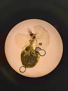 This particular species is of special scientific interest because a patented strain, called "C-Fern", was developed as a scientific aid and teaching tool in biology in 1995.[2] The use of "C-Fern" is facilitated by the fact that it grows readily in a cell-culture dish on agar media, reaching sexual maturity within 2–3 weeks of spore inoculation, with motile sperm cells being visible at this time. Over the course of about 6 weeks germination, sex determination and development of gametophytes, fertilization, embryogenesis, organogenesis, and sporophyte growth can all be observed, allowing an incredibly comprehensive study of the life cycle of homosporous ferns in a relatively short time period.[3] In addition, due to the small size of the plant many specimens can be observed growing simultaneously, allowing for larger sample sizes in research studies. Following the culture of "C-Fern" in dishes it can be transplanted to a dirt substrate, where it can be further allowed to grow and future generations can be used for subsequent studies.
