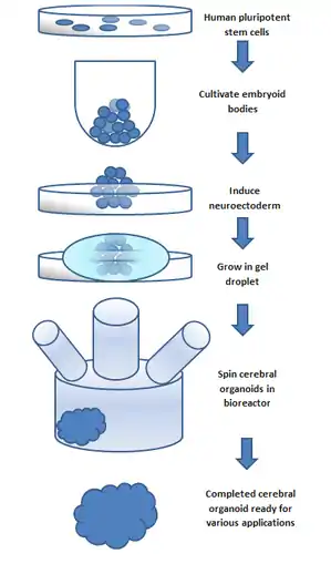 To make an organoid, an embryoid (tissue that has some embryonic features) grown from natural stem cells is used. Embryos have three layers: endoderm, mesoderm and ectoderm. Each turns into various body parts. The nervous system grows from the ectoderm (which also contributes dental enamel and the epidermis).[5] Ectodermal cells were placed into gel droplets and floated in a nutrient broth in a rotating bioreactor, which supported cell growth without forming by the container. After ten days the organoid developed neurons. After 30 days it displayed regions similar to parts of brains. Lacking a blood supply, cerebral organoids reach about 4 mm across and can last a year or more.[3] The general procedure can be broken down into 5 steps. First human pluripotent stem cells are cultured. They are then allowed to cultivate into an embryoid body. Next the cell culture is induced to form a neuroectoderm. The neuroectoderm is then grown in a matrigel droplet. The matrigel provides nutrients and the neuroectoderm starts to proliferate and grow. It's important to note that, while these cells are self organizing, replication of specific brain regions in cerebral organoid counterparts is achieved by the addition of extracellular signals to the organoid environment during different stages of development; these signals were found to create change in cell differentiation patterns, thus leading to recapitulation of the desired brain region.[4] Normally, SMAD inhibition is used in usual cerebral organoid culturing processes; recent studies show that inhibition of this process generates microglia in cerebral organoids.[6] It's important to note that the lack of vasculature limits the size the organoid can grow. This has been the major limitation in organoid development; recently, however, new methods using a spinning bioreactor have allowed an increase in the availability of nutrients to cells inside the organoid. This last step has been the key breakthrough in organoid development.[7] Spinning bioreactors have been used increasingly in cell culture and tissue growth applications. The reactor is able to deliver faster cell doubling times, increased cell expansion and increased extra-cellular matrix components when compared to statically cultured cells.[8]