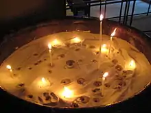 Candles are a traditional part of Buddhist ritual observances. Along with incense and flowers, candles (or some other type of light source, such as butter lamps) are placed before Buddhist shrines or images of the Buddha as a show of respect. They may also be accompanied by offerings of food and drink.[37] The light of the candles is described as representing the light of the Buddha's teachings, echoing the metaphor of light used in various Buddhist scriptures.[37][38] See Loy Krathong and Ubon Ratchathani Candle Festival for examples of Buddhist festivals that makes extensive use of candles.