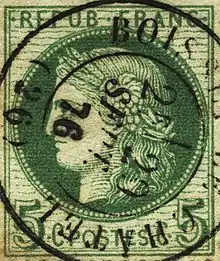 The two first postal stamps issued in France were of the Ceres series. They were printed with the effigy of Ceres, goddess of growing plants in Roman mythology. She wore a garland of wheat and a bunch of grapes in her hair. The design, which avoided any specifically republican or Revolutionary connotations, was drawn by Jacques-Jean Barre, general engraver at the Paris Mint, under the supervision of Anatole Hulot, a civil servant who obtained the right to print the stamps at the Mint until 1876.[1]