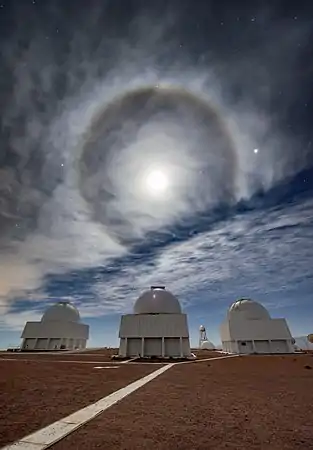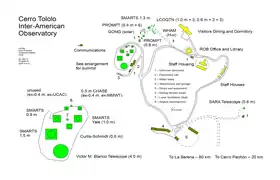 The principal telescopes at CTIO are the 4 m Víctor M. Blanco Telescope, named after Puerto Rican astronomer Victor Manuel Blanco, and the 4.1 m Southern Astrophysical Research (SOAR) telescope, which is situated on Cerro Pachón.[4] Other telescopes on Cerro Tololo include the 1.5 m, 1.3 m, 1.0 m, and 0.9 m telescopes operated by the SMARTS consortium. CTIO also hosts other research projects, such as PROMPT, WHAM, and LCOGTN, providing a platform for access to the southern hemisphere for U.S. and worldwide scientific research.[5]