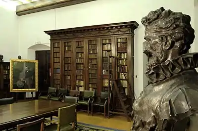 Finally, the oil portrait of Isidre Bonsoms, by the painter José María Vidal-Quadras and the bonze bust of Cervantes by the sculptor Josep Reynés, preside in the Sala Cervantina of the Biblioteca de Catalunya.[6]