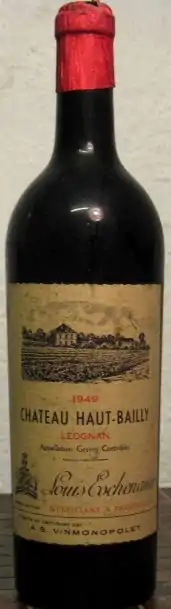Château Haut-Bailly is a Bordeaux wine from the Pessac-Léognan appellation, ranked among the Crus Classés for red wine in the Classification of Graves wine of 1953 and 1959. The winery and vineyards are located south of the city of Bordeaux, in the commune of Léognan.