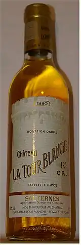 Records date the estate's origins to the 18th century, and connect them to Jean Saint-Marc du Latourblanche, treasurer-general to Louis XIV. Following the French Revolution, the estate was owned by Pierre Pécherie, but a later owner, the German Frederic Focke raised the reputation of the winery, and was for a period credited with bringing the tradition of sweet white wine to Sauternes from his Rhine origins.[1] After the rewarding outcome of the 1855 Classification and Focke's death, the estate was eventually acquired by Daniel "Osiris" Iffla who among several patriotic acts, testamented La Tour Blanche to the State upon his death in 1907, on the condition it would become an agricultural college.[1] From 1911, the La Tour Blanche School of Viticulture and Oenology has been responsible for education and training of wine industry professionals, as well as running La Tour Blanche as a classed winery.