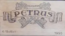 Close up of wooden wine crate used to ship bottles of Pétrus.