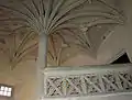 Stone staircase with central column and palm tree vaulting.