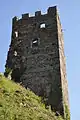 The castle consists of a polygonal enceinte enclosing a cylindrical keep, 8.5 meters in diameter and 22m high. Constructed from stone rubble, it is divided into five floored levels. The top floor is the only one to be lit; the others are pierced by arrowslits in niches. In a corner of the curtain wall, slightly lower, is a second, square, tower. Habitable and measuring 8.5 m square, it is divided like the keep into five floored levels, lit by rectangular windows. Heavily thickened at the base, its walls are 22.8 m high and 1.55 m thick. Various buildings attached to the ramparts are spread around the courtyard.