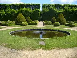The castle is approached through an alley of hornbeam trees five meters high, with two formal gardens with basins, surrounded by hedges. Next to the castle is a labyrinth with a rose garden in the centre. Diirectly in front of the castle is a topiary garden.