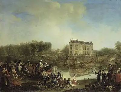 - Fête donnée par le Prince Louis François de Conti en l'honneur de Charles Guillaume Ferdinand, prince héréditaire de Brunswick-Lunebourg en 1766 : Le cerf pris dans l'eau devant le château de L'Isle-Adam