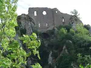 The Château de Roquefixade is a ruined castle built on a cliff overlooking the village of Roquefixade, situated 8 km (5 miles) west of Lavelanet French département of Ariège.[1]
