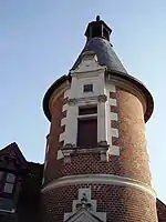 The tower dates from the 19th century. Modeled on the towers of the Louis XII wing of the Château de Blois, it shares their most notable characteristic: lattices of red and black bricks. Above a François I shell, a small marmouset commemorates the construction with a banner in Latin: "united by friendship, Louis de la Saussaye wanted, Jules de la Morandière realized".