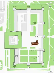 During the reign of Napoleon, the chateau and its buildings underwent considerable reconstruction to serve as a military arsenal. A new wooden floor divided the Sainte-Chapelle into upper and lower levels, and it was turned into a storehouse for munitions. The Pavilion of the King and the Pavilion of the Queen became barracks for the garrison. Most of the towers of the surrounding wall, which were in a poor state of repair, were demolished, with the exception of the Tower of the Village, which still has its original height, and the Tower of the Woods, which had collapsed earlier.[8] The moat of the chateau was also the site of a famous execution, that of Duc d'Enghien, which took place on 21 March 1804. He was accused of trying the reinstate the royal government. A willow tree in the moat was planted to mark the place he was executed, and is still there today.[7]