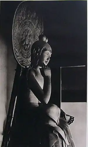 The camphor wood statue of Miroku (菩薩半跏像) is a National Treasure dating from the Asuka period. Formerly painted, it is finished in lacquer.[3][7][8][9]