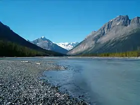 The Chaba River is a major tributary of the Athabasca. The Chaba is fed by the glacial melt originating in the Chaba Icefield, comprising Chaba Peak, as well as Listening and Sundial Peaks. A small glacier on Mount Quincy also contributes to the Chaba. The river was given its name by A. P. Coleman, a geologist born in Eastern Canada in 1852.[2] He stated there "were endless beaver dams and trees" along the river, and named it after the Stoney Indian word for beavers."[3]