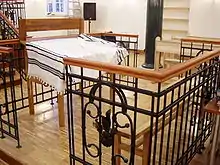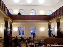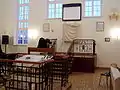 A square bimah with two entrances is located in the middle of the room, also rounded by a balustrade. Formerly, a 180 kilogramme, menorah with the Polish Eagle on the top was located in Synagogue. It was given to the yeshiva by the Jewish kehilla from Przemyśl.[1]