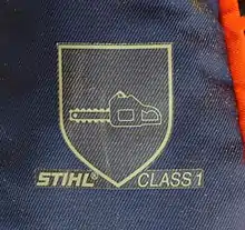 In the EU, chainsaw trousers, boots and gloves (the items containing chainsaw protective fabric) must carry a special chainsaw logo.[2] This shows that the fabric is of a type tested to protect properly, and also shows the class of protection, the rated maximum chain speed.