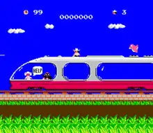 The first level (or "scene") is titled "STOP THE EXPRESS!". The villain, Don Waldorado, has abducted Princess Maria, and is escaping on a special express train. Challenger heads for the front train car while avoiding Waldorado's cronies, but Waldorado cuts off the connection between the rear train cars and escapes after pushing Challenger off the train.
