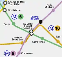 Champ de Mars (French pronunciation: [/ʃɑ̃ d(ə) maʁs/]) is a ghost station along line 8 of the Paris Métro, between the stations la Motte-Picquet - Grenelle and École Militaire. It is situated in the 7th arrondissement of Paris, to the southwest of the public garden called Champ de Mars.