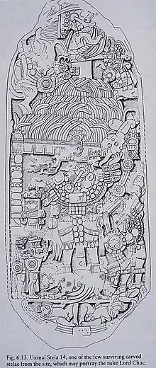 While informally named Lord Chac (or Chan Chaak Kʼakʼnal Ajaw), hieroglyphs found in Uxmal give his full personal name as Kʼahkʼ Pulaj Chan Chaahk (Chaahk That Burns The Sky With Fire).[1] The phrase Kʼahkʼnal Ajaw may very well be a title denoting him as the king of Kʼahkʼnal, which may indicate this to be the local toponym of Uxmal itself instead of a part of the king's name. An argument in favour of this idea is that, while the title is given on the aforementioned ballcourt marker, it is absent on stela 14, on which this paramount is depicted. Here Lord Chac is depicted as a Chaahk impersonator, wearing a cutaway mask of the deity, his broad hat, conch-shell trumpet, axe and incense bag. The hieroglyphic inscription transcribes as ubaah kʼahkʼ pulaj chan chaahk tzeh kab kʼin, meaning "it is the image of K'ahk' Pulaj Chan Chaahk, left hand of the sun" (transcription and translation by the editor; for a better drawing see external links).