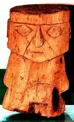 Human heads carved in wood were common. They were used to crown the mummies of important dignitaries, as a mark of their status as deity or mythical ancestor, which they acquired after death. The human images in wood could also be indicators of political power, especially when they were carved into sticks or batons of command.