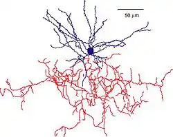 ![]() Reconstruction of a mouse chandelier cell. Soma and dendrites are labeled in blue, axon arbor in red. (Woodruff & Yuste, 2008, PLoS Biology)[1] | |