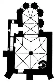 The chapel was most likely constructed before 1326, when it was part of the castle complex.[3] In the 14th century, it was a single-storey building with a crypt. It possessed a nave, as well as a polygonal presbytery, which was contained within the circumference of the castle's defensive walls. In 1407, the chapel was rebuilt in the gothic style by order of King Ladislaus II Jagiello (Jogaila of Lithuania). After increasing the height of the walls, the chapel became a two-storey structure, maintaining the old crypt. The form of the church was dominated by two steep step-patterned gables which survived until the 1650s. The lowest level of the building was designated as a crypt for deceased chaplains and local administrators, while the upper levels were used for religious services. The polygonal presbytery as well as the square nave were rib-vaulted. The vaulting of the nave was supported by a centrally-planned pillar. This structural element was typical for the sacral and secular architecture during the reign of Casimir III the Great. During the Renaissance, the church maintained a gothic character, however the entrance was positioned on the first floor (that is, one floor above ground-level) and was framed by a new Renaissance portal, made in the Komasków masonry workshop. It wasn't until the 17th century that the façade of the chapel was crested with a gable and attic in the style of the Lublin Renaissance. During the parliamentary sessions in 1569 regarding the Union of Lublin, a holy mass was held at the Holy Trinity Chapel, asking for successful deliberations.[3] Some of participants left inscriptions on the walls of the chapel commemorating the event.[3]