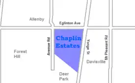 Chaplin Estates is a neighbourhood that covers the southwest portion of the Yonge and Eglinton area in Toronto, Ontario, Canada. It lies west of Yonge Street and is bounded by Eglinton Avenue to the north and Avenue Road to the west. The southern boundary is Chaplin Crescent which itself runs parallel to the former Beltline Railway line, now the Beltline Trail, a scenic walking and biking trail.