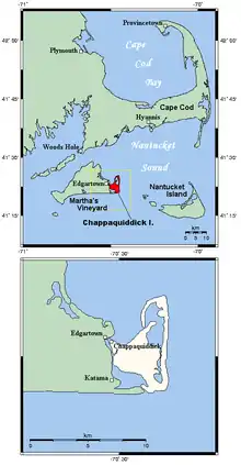 Chappaquiddick Island (Massachusett language: Noepetchepi-aquidenet;[1] colloquially known as "Chappy"), a part of the town of Edgartown, Massachusetts, is a small peninsula and occasional island on the eastern end of Martha's Vineyard. Norton Point, a narrow barrier beach, connects Martha's Vineyard and Chappaquiddick between Katama and Wasque (pronounced way-sqwee). Occasional breaches occur due to hurricanes and strong storms separating the islands for periods of time. Most recently, the two were separated for 8 years from 2007 to 2015.[2][3] While both land forms have mostly been connected to one another in modern history, Chappaquiddick is nevertheless referred to as an island.