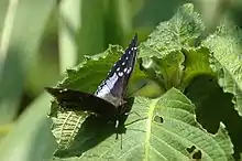 The butterfly's wingspan is 85 to 100 mm. Adults are black with white and blue bands and spots. The hindwings each have two little tails.[2]