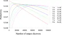 in an EMCCD there is a dispersion (variation) in the number of electrons output by the multiplication register for a given (fixed) number of input electrons (shown in the legend on the right). The probability distribution for the number of output electrons is plotted logarithmically on the vertical axis for a simulation of a multiplication register. Also shown are results from the empirical fit equation shown on this page.