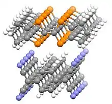In 1954, charge-transfer salts derived from perylene with iodine or bromine were reported with resistivities as low as 8 ohm·cm.[3] In 1973, it was discovered that a combination tetracyanoquinodimethane (TCNQ) and tetrathiafulvalene (TTF) was shown to form a strong charge-transfer complex, henceforth referred to as TTF-TCNQ.[11] The solid shows almost metallic electrical conductance and was the first discovered purely organic conductor. In a TTF-TCNQ crystal, TTF and TCNQ molecules are arranged independently in separate parallel-aligned stacks, and an electron transfer occurs from donor (TTF) to acceptor (TCNQ) stacks. Hence, electrons and electron holes are separated and concentrated in the stacks and can traverse in a one-dimensional direction along the TCNQ and TTF columns, respectively, when an electric potential is applied to the ends of a crystal in the stack direction.