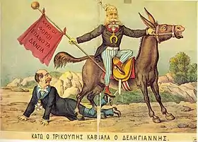 Trikoupis tried to make terms with the creditors of his nation, but he failed in that too. The taxation measures he proposed to combat the country's bankruptcy aroused great hostility, and in January, 1895 he resigned.[2] At the general election, four months later, he and his Modernist Party were astoundingly defeated by his main political rival, Theodoros Deligiannis, and Trikoupis did not even manage to win a seat in the parliament. This led to him resigning from politics and moving to Cannes.