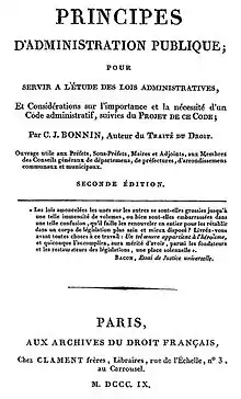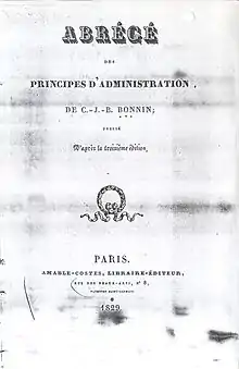 Bonnin, Charles-Jean Baptiste (4 October 1772 in France – October 1846) Progressive French thinker, theorist, and framer of the modern discipline of Public Administration.[1] From Bonnin's written work a great political and intellectual activity is clear. His academic works credit him as a forerunner of public, constitutional and administrative law. Actually, his 'Social Doctrine' situates him amongst the initiators of the science later known as Sociology. He also practiced parliamentary review and was interested in educational problems. Auguste Comte described Bonnin as a "mature and energetic man, a person with a spontaneous deep kinship for positivism and in whom we can find the true spirit of the Revolution".[2]
