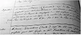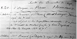 Alkan was a child prodigy.[17] He entered the Conservatoire de Paris at an unusually early age, and studied both piano and organ. The records of his auditions survive in the Archives Nationales in Paris. At his solfège audition on 3 July 1819, when he was just over 5 years 7 months, the examiners noted Alkan (who is referred to even at this early date as "Alkan (Valentin)", and whose age is given incorrectly as six-and-a-half) as "having a pretty little voice". The profession of Alkan Morhange is given as "music-paper ruler". At Charles-Valentin's piano audition on 6 October 1820, when he was nearly seven (and where he is named as "Alkan (Morhange) Valentin"), the examiners comment "This child has amazing abilities."[18]
