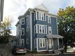 The Charles A. Hall Three-Decker is a historic triple-decker house in Worcester, Massachusetts. Built c. 1896, it is a well-preserved example of a triple-decker with Queen Anne styling. It follows a typical side hall plan, but has a squared front bay that is unusual for that part of the city. The bay is decorated with bands of cut shingles, and has window overhangs between floors. The bay is topped by a decorated projecting gable.[2]