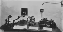Apgar's equipment was mostly homemade with the exception of the headphones and of an improved Audion designed by Edwin Howard Armstrong that was part of the circuit used to detect and amplify the signal.[20] It was connected to a Dictaphone which allowed him to record Morse code transmissions on wax cylinders made by Edison Manufacturing Company.[21] His first recording was made October 12, 1913, of the New York Herald station, which by this time was using the call sign WHB.[lower-alpha 2] By October 1914, he had recorded other transmissions including the United States Navy station NAA sending time signals.[14]