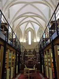 | St Antony's College library | Oxford | ![]() | Altar front, Three panel paintings round apse of chapel | The Convent at St Giles Oxford (Holy Trinity Convent) | Oxford | For the Rev Mother | "The apse was adorned with paintings by Charles Edgar Buckeridge, the original architect's son, and Ethel King Martin; they were restored in 1996."[7] "This entry probably refers to the altar front, painted originally for the temporary chapel. Later, Buckeridge added three of the panel paintings round the apse of the chapel".[3] "At Holy Trinity Convent he painted the front of the main altar (now at Malvern) and two of the side panels." The location of the altar front is now not known. It might originally have been moved to the Convent of the Holy Name, Malvern Link, in 1946, but that closed in 1990. | ||||