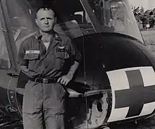 Kelly dropped out of high school and lied about his age in order to enlist in the Army at the age of 15. He used a birth date of 22 December 1922 and enlisted under the name "Charles L. Kelley".[3] He reported for active duty at Fort Screven, Georgia, on 25 February 1941 for 1 year of service as an army medic. As enlistment contracts at that time included an "or duration plus six months" clause, Kelly left the service as a corporal on 3 August 1945.[2][4] He served overseas with the 30th Infantry Division and, although he was listed as a medic as late as May 1944,[5] he was serving as an infantryman when he was wounded by an artillery shell fragment during the battle for Aachen, Germany.[6] Kelly's injury was a severe one, a compound fracture of the fibula which kept him hospitalized for treatment and recovery from the time he was wounded in October 1944 until June 1945.[7] Patrick Henry Brady, who served under Kelly in South Vietnam, said that Kelly's experience as a wounded infantryman was what would later drive him as a medical evacuation pilot.[8]