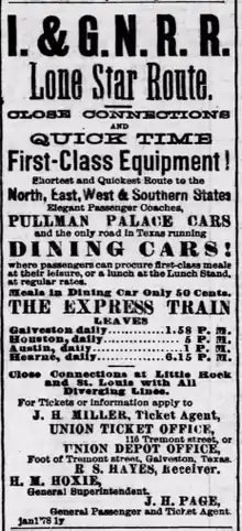 Meanwhile, in Texas, Morgan started withdrawing from Galveston as a port. The Galveston Wharf Company no longer gave his ships favored treatment. In addition, the only railroad from that city—the Galveston, Houston and Henderson—could not run any of its rolling stock north of Houston. Morgan also adapted to the progress of the railroad networks. First, in 1873, he changed his freight tariffs from rates by container volumes to rates per hundred pounds of weight. Second, he had started a plan to bypass Galveston as a logistics center in favor of Houston.[48] Around the same time, he also forwarded his passengers and freight through the Houston Direct Navigation Company, which transferred between coastal steamers to Buffalo Bayou packets in Galveston Bay, thus avoiding the port of Galveston, along with its regulations and fees. Houston Direct Navigation Company ran its steamers from Galveston Bay to the wharf at Houston. Later he bought enough stock in the company to become its largest shareholder, further aligning his interests with Houston and against Galveston.[47]