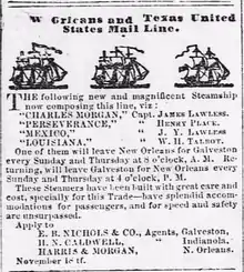 In 1837, Morgan started running steamboat service between New Orleans and Galveston, Texas, which was the first packet boat service running between these cities on a regular schedule.[1] However, this had not been Morgan's first foray in shipping in the Gulf of Mexico. The previous year, the New York and Charleston Steam Packet Company deployed the steamship David Brown to sail a route from New Orleans to Key West, Florida, and Havana, Cuba. The Home catastrophe forced a reorganization of the partnership, with the new company shifting its emphasis to the Gulf trade, and Columbia sailed out of the port of New Orleans for Galveston on November 18, 1837, about five weeks after the Home wreck.[11]